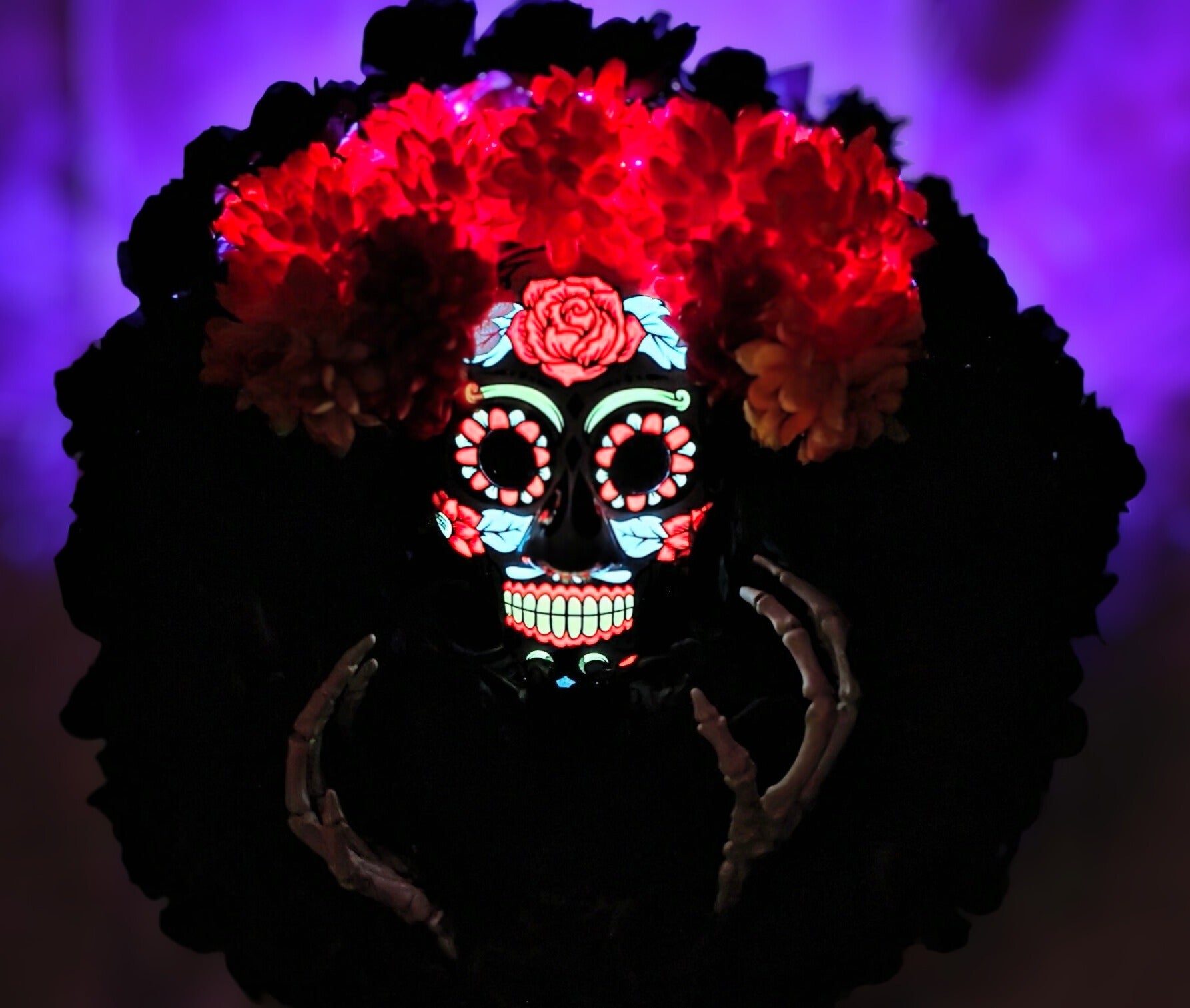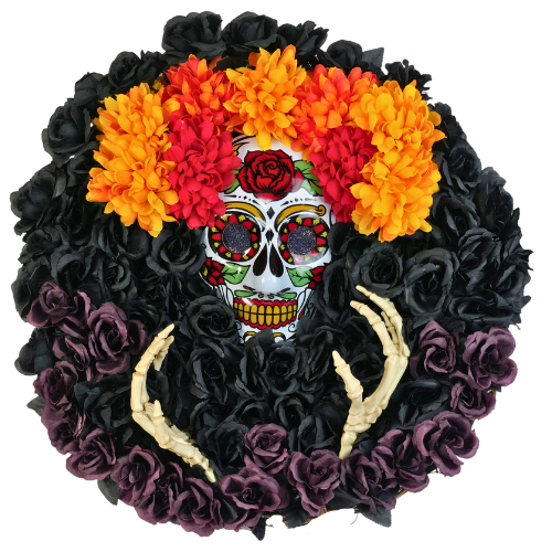 Dia de los Muertos mask, plastic skeleton hands, bright orange, yellow and red mums and gothic roses