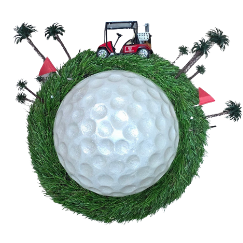 Molded styrofoam center, astroturf, plastic palm trees, golf cart & golf balls (hard to find in the rough 😉)
