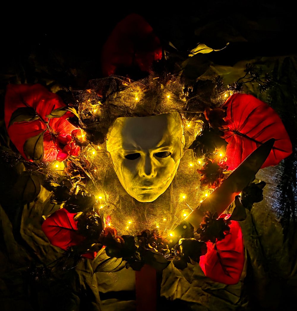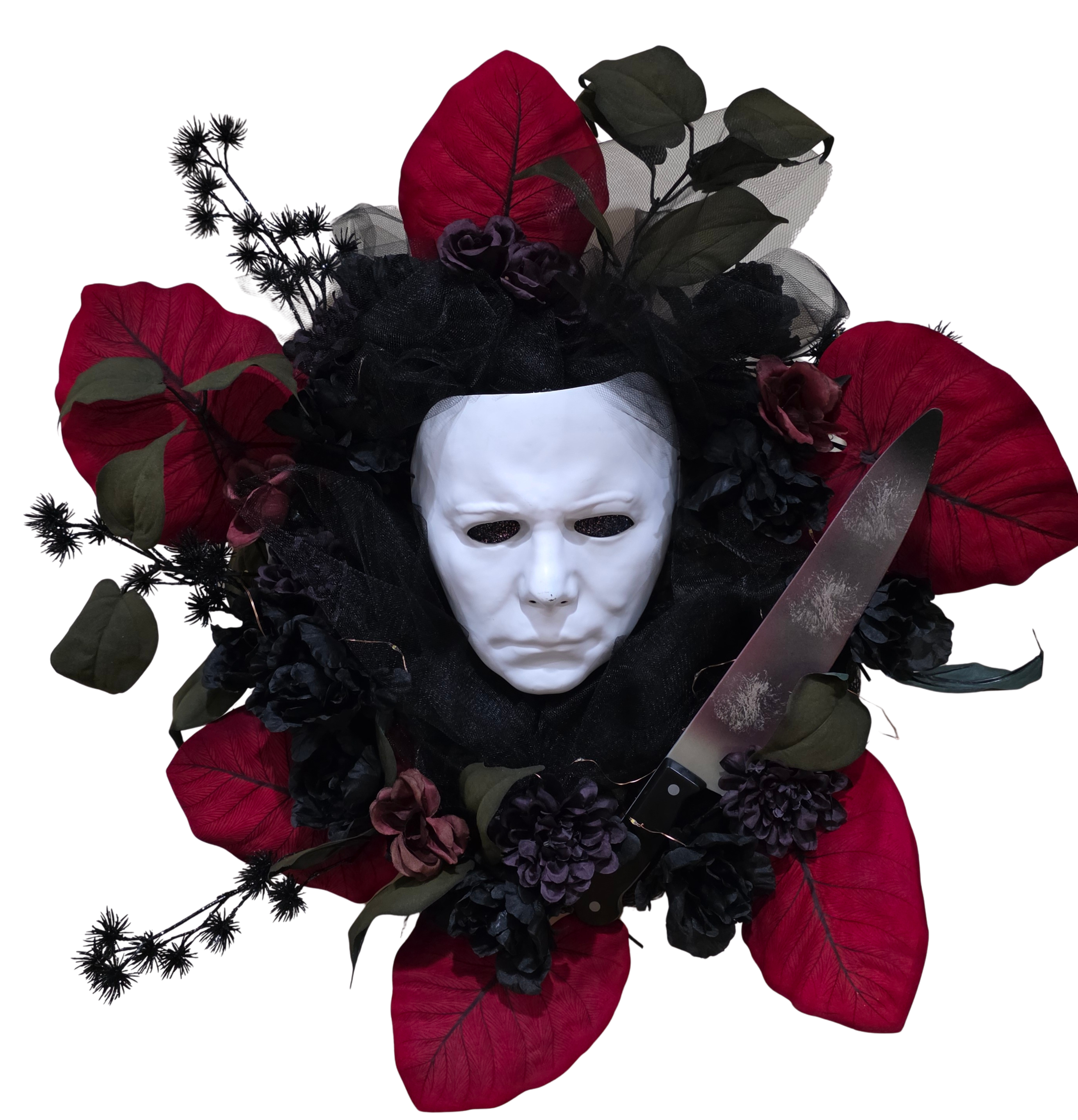 Michael Myers mask, chef's knife, tulle, gothic florals
