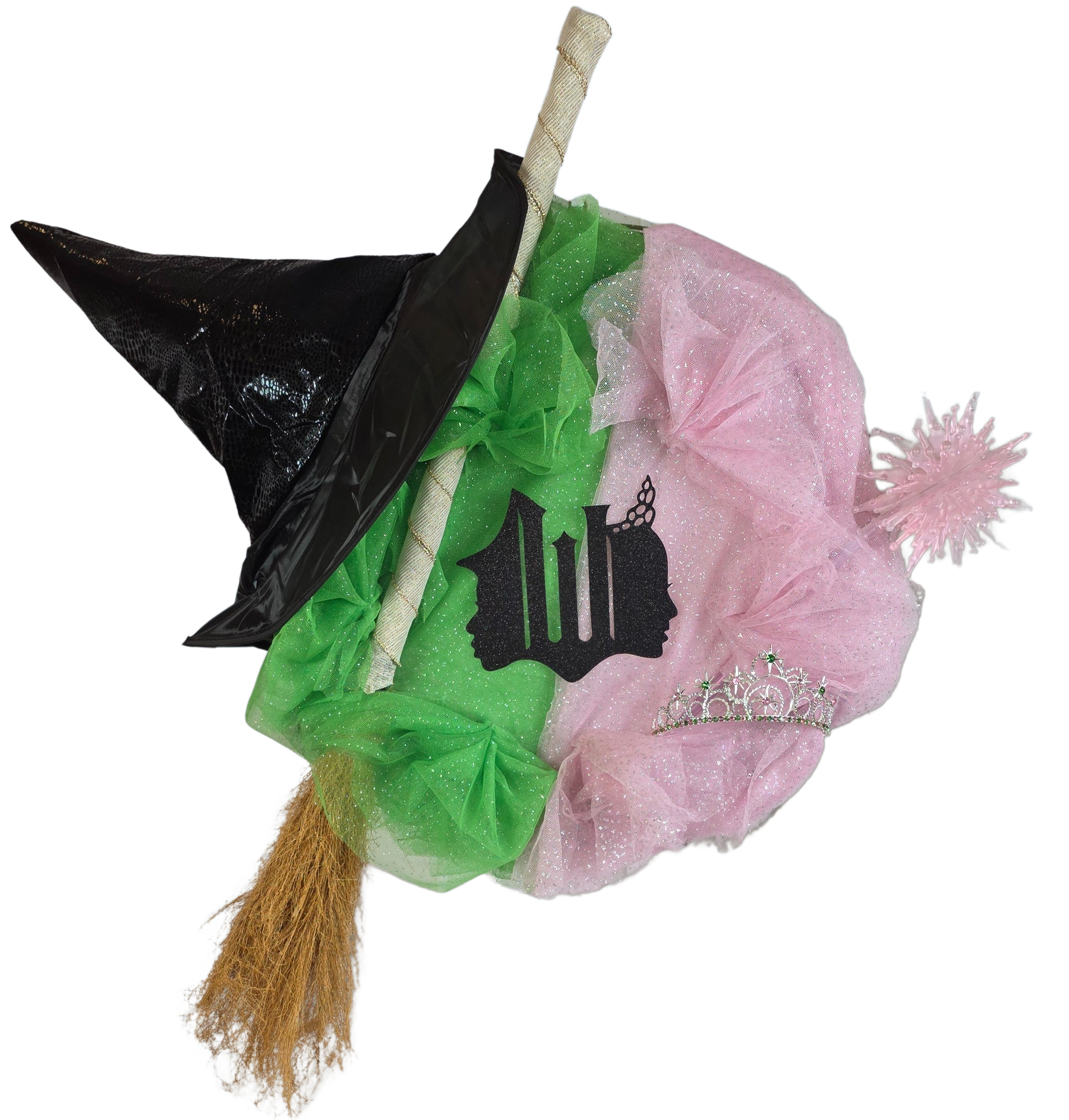 Witch's hat, tulle, straw broom, shimmery rhinestone tiara and authentic Wicked Glinda bubble wand. Light string also included.